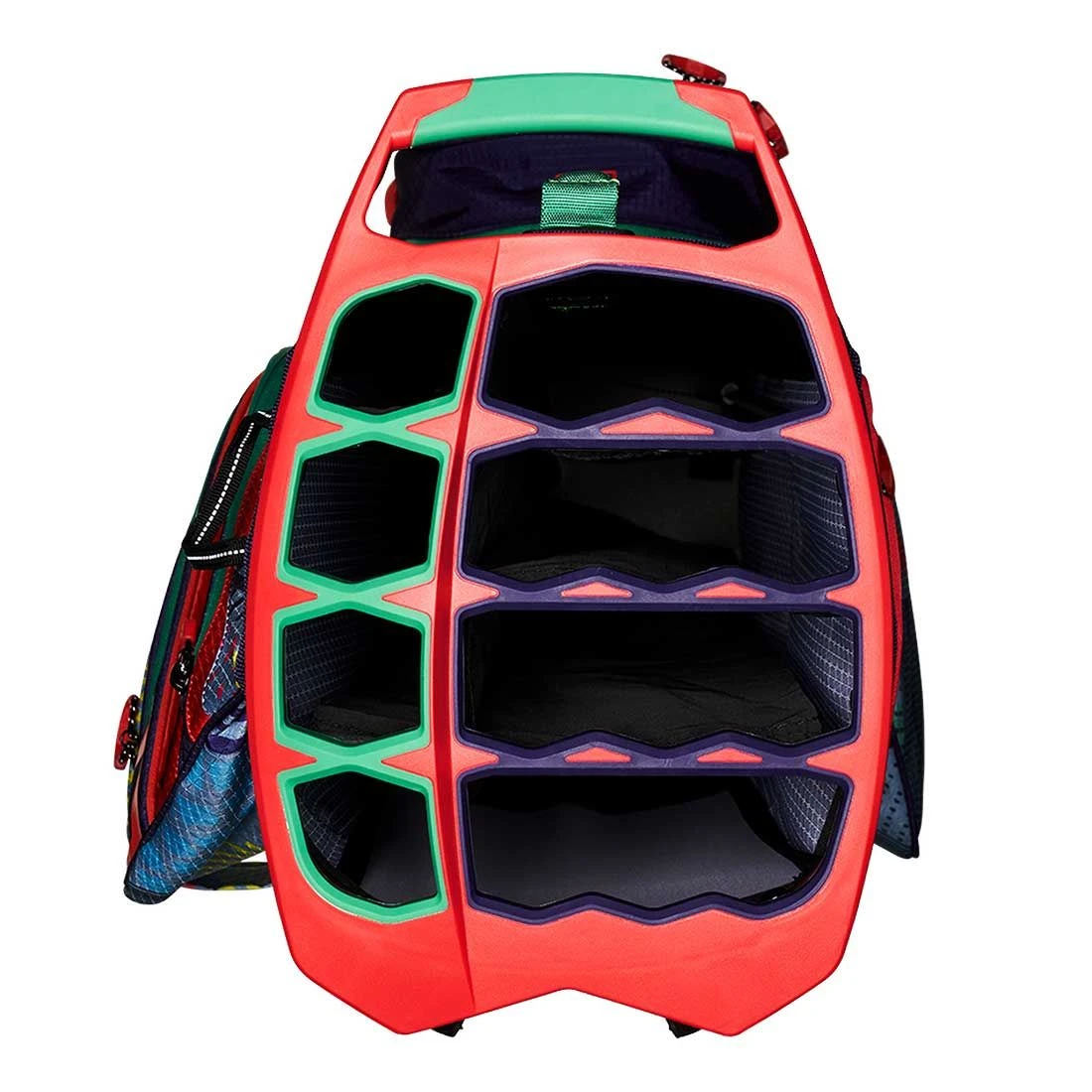 New 8-way WOODĒ top better organizes your woods and your irons with extra room for large putter grips - 9 front facing pockets including a Rapid Access Snap Ball Pocket, and a Rapid Access Snap fleece lined valuables pocket, and water bottle pocket with drainage port